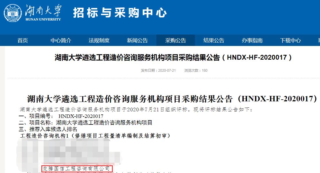 恭賀本公司中標湖南大學工程造價咨詢服務機構庫