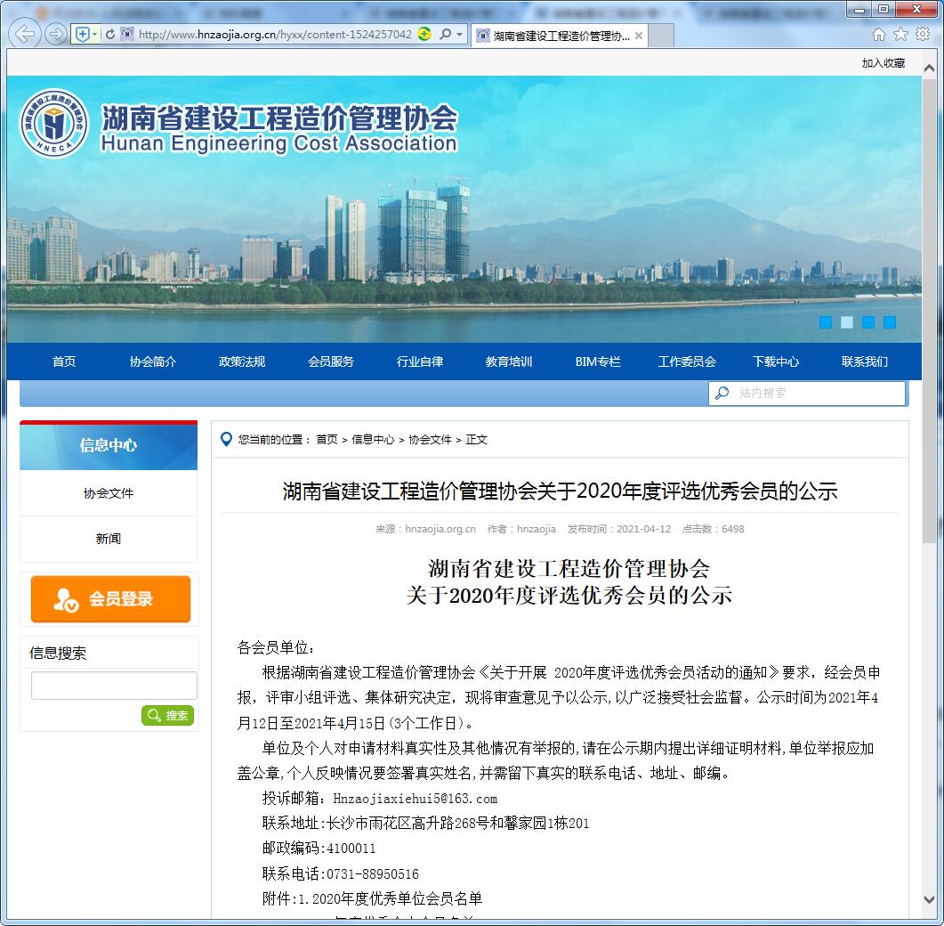 根據(jù)湖南省建設(shè)工程造價(jià)管理協(xié)會(huì)《關(guān)于開(kāi)展2020年度評(píng)選優(yōu)秀會(huì)員活動(dòng)的通知》要求,經(jīng)會(huì)員申報(bào),評(píng)審小組評(píng)選、集體研究決定,我單位被評(píng)為“2020年度優(yōu)秀單位”。
