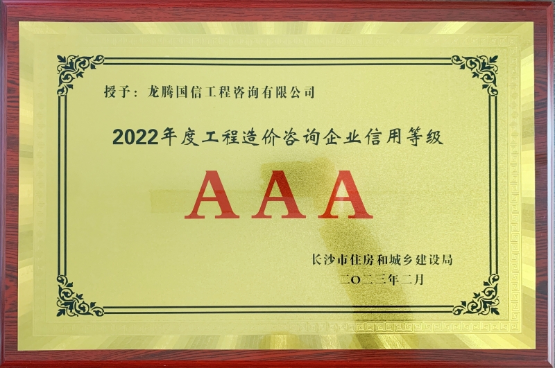 近日,長(zhǎng)沙市住房和城鄉(xiāng)建設(shè)局為加強(qiáng)工程造價(jià)咨詢行業(yè)管理,組織開展了2022年度工程造價(jià)咨詢企業(yè)市場(chǎng)行為誠(chéng)信評(píng)價(jià)工作,我單位獲評(píng)“2022年度工程造價(jià)咨詢企業(yè)信用等級(jí)AAA”。