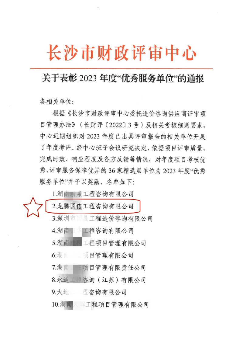 根據(jù)《長沙市財政評審中心委托造價咨詢供應商評審項目管理辦法》(長財評〔2022〕3號)及相關考核細則要求,長沙市財政評審中心近期組織對2023年度已出具評審報告的相關單位開展了年度考評。經(jīng)長沙市財政評審中心班子會議研究決定,依據(jù)項目評審質量、完成時效、響應程度及各方反饋等情況,根據(jù)對年度項目考核優(yōu)秀、評審服務保障優(yōu)異的精選層單位評選,我單位龍騰國信工程咨詢有限公司被評為2023年度“優(yōu)秀服務單位”。