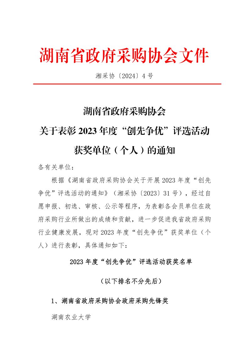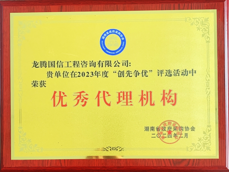 根據(jù)《湖南省政府采購協(xié)會(huì)關(guān)于開展2023年度“創(chuàng)先爭(zhēng)優(yōu)”評(píng)選活動(dòng)的通知》(湘采協(xié)〔2023〕31號(hào)),為表彰各會(huì)員單位在政府采購行業(yè)所做出的成績和貢獻(xiàn),進(jìn)一步促進(jìn)我省政府采購行業(yè)健康發(fā)展,我單位獲評(píng)2023年度“優(yōu)秀代理機(jī)構(gòu)”。