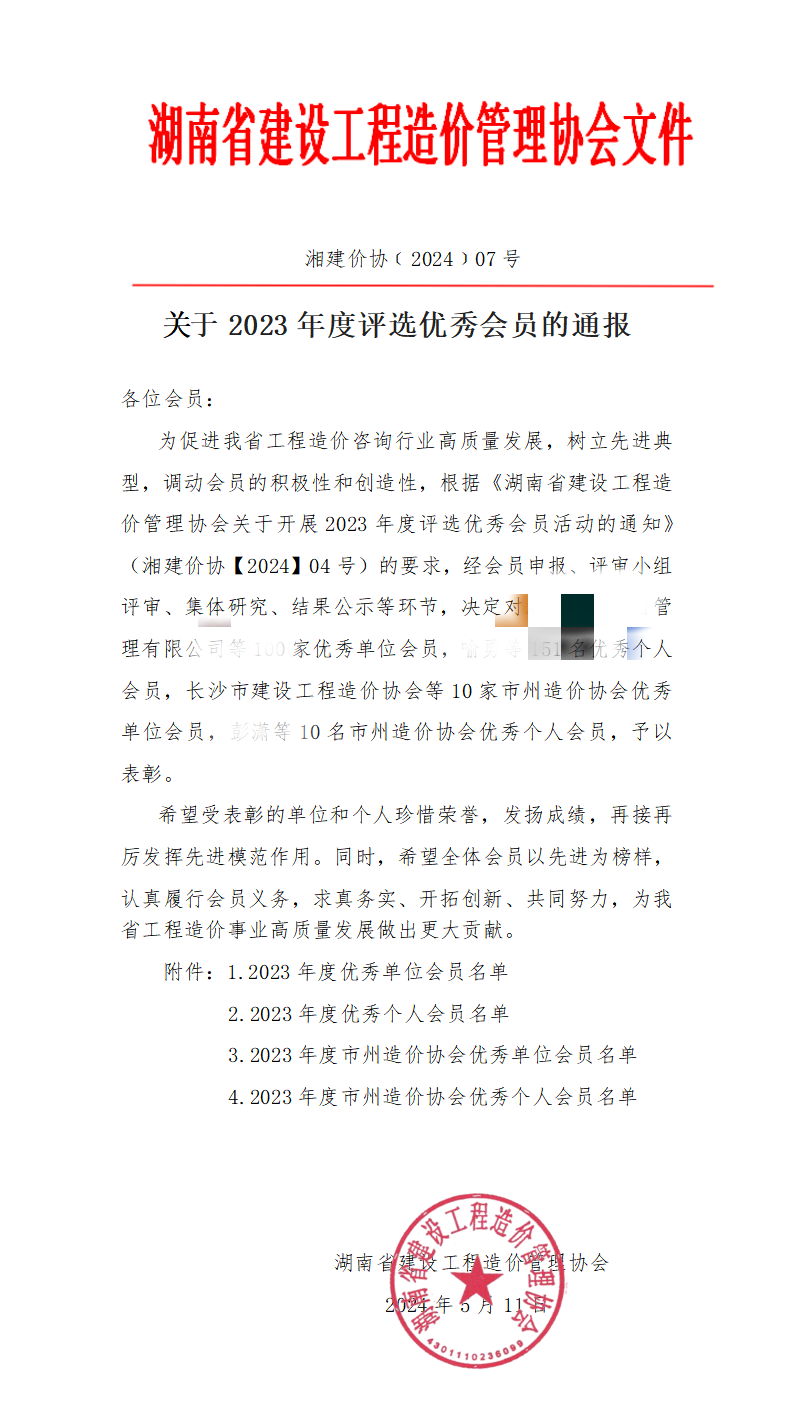 為促進我省工程造價咨詢行業(yè)高質(zhì)量發(fā)展,樹立先進典型,根據(jù)《湖南省建設(shè)工程造價管理協(xié)會關(guān)于開展2023年度評選優(yōu)秀會員活動的通知》(湘建價協(xié)【2024】04號)的要求,經(jīng)申報、評審小組評審、集體研究、結(jié)果公示等環(huán)節(jié),我單位被評為“2023年度優(yōu)秀單位”。
