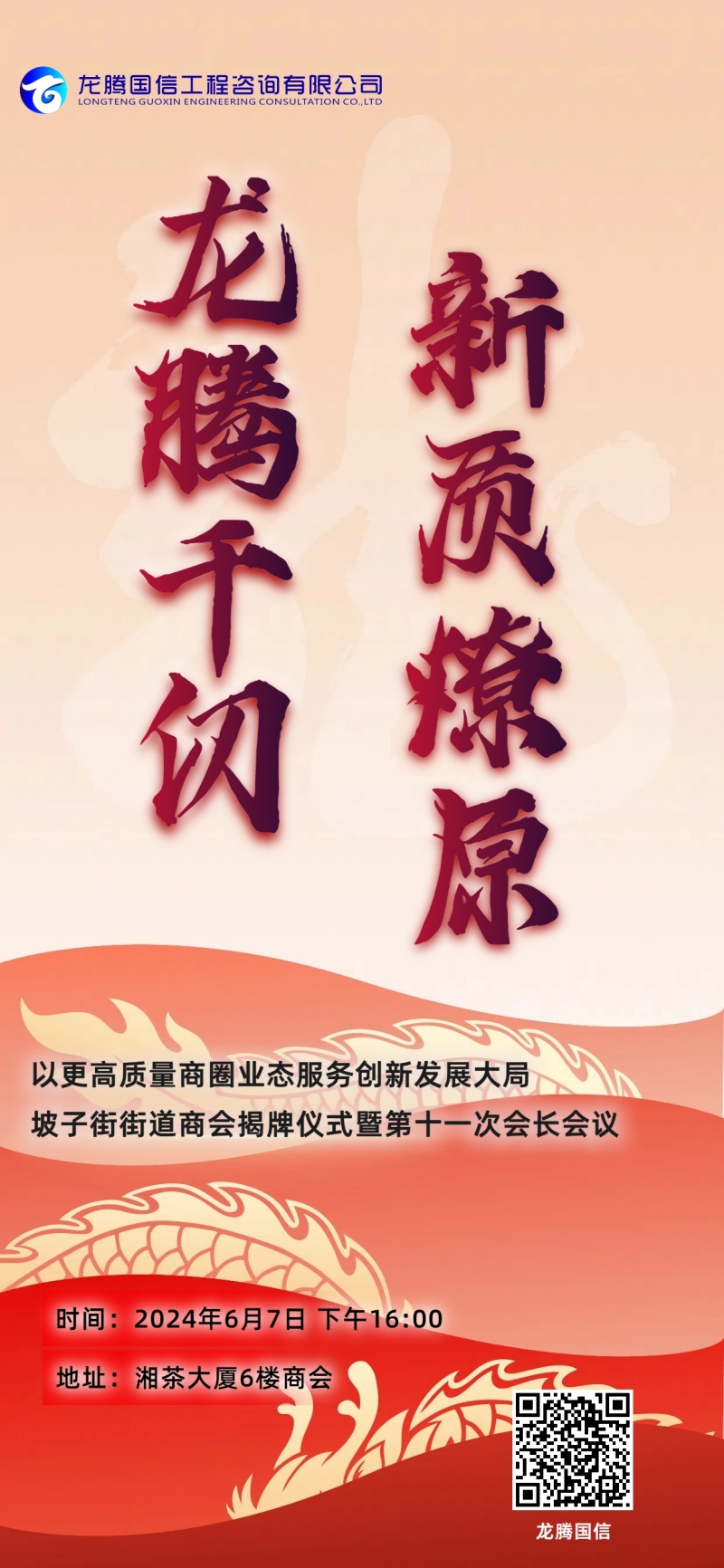 2024年6月,由龍騰國(guó)信工程咨詢有限公司承辦的‘龍騰千仞,新質(zhì)燎原’以以更高質(zhì)量商圈業(yè)態(tài)服務(wù)創(chuàng)新發(fā)展大局,坡子街街道商會(huì)揭牌儀式暨第十一次會(huì)長(zhǎng)會(huì)議,在坡子街街道商會(huì)舉行。