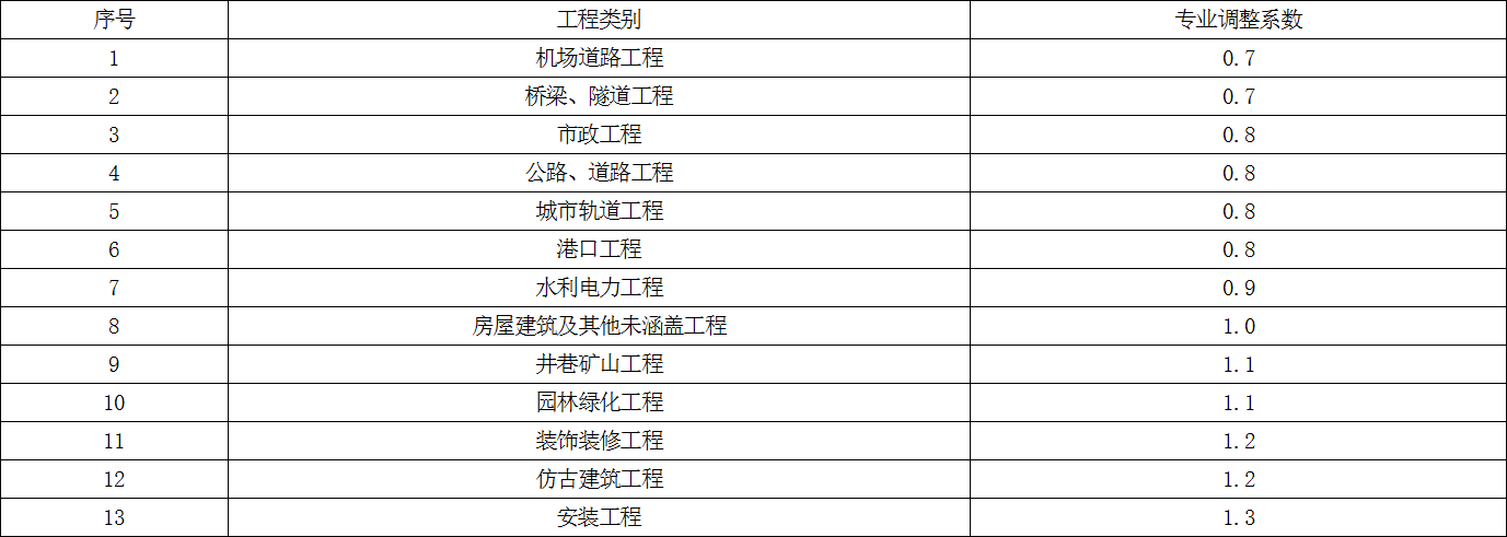 注:1、房屋建筑工程和其他未涵蓋的專業(yè)調(diào)整系數(shù)為1;