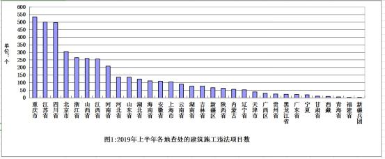 從各地查處的違法工程項(xiàng)目數(shù)量看,重慶、江蘇、四川3?。ㄊ校┎樘幜Χ容^大,分別查處項(xiàng)目535個(gè)、500個(gè)、496個(gè)(見(jiàn)圖1)。